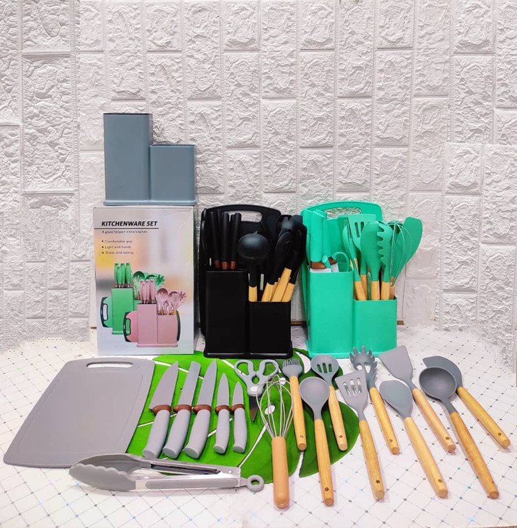 سرویس ۱۹ پارچه کفگیر و ملاقه و کارد همراه با تخته اشپزخونه کاملا سلیکونی ۱۰۰٪ نسوز دسته بامبو با استند ۲ قلو برند Kitchen set ( وارداتی )